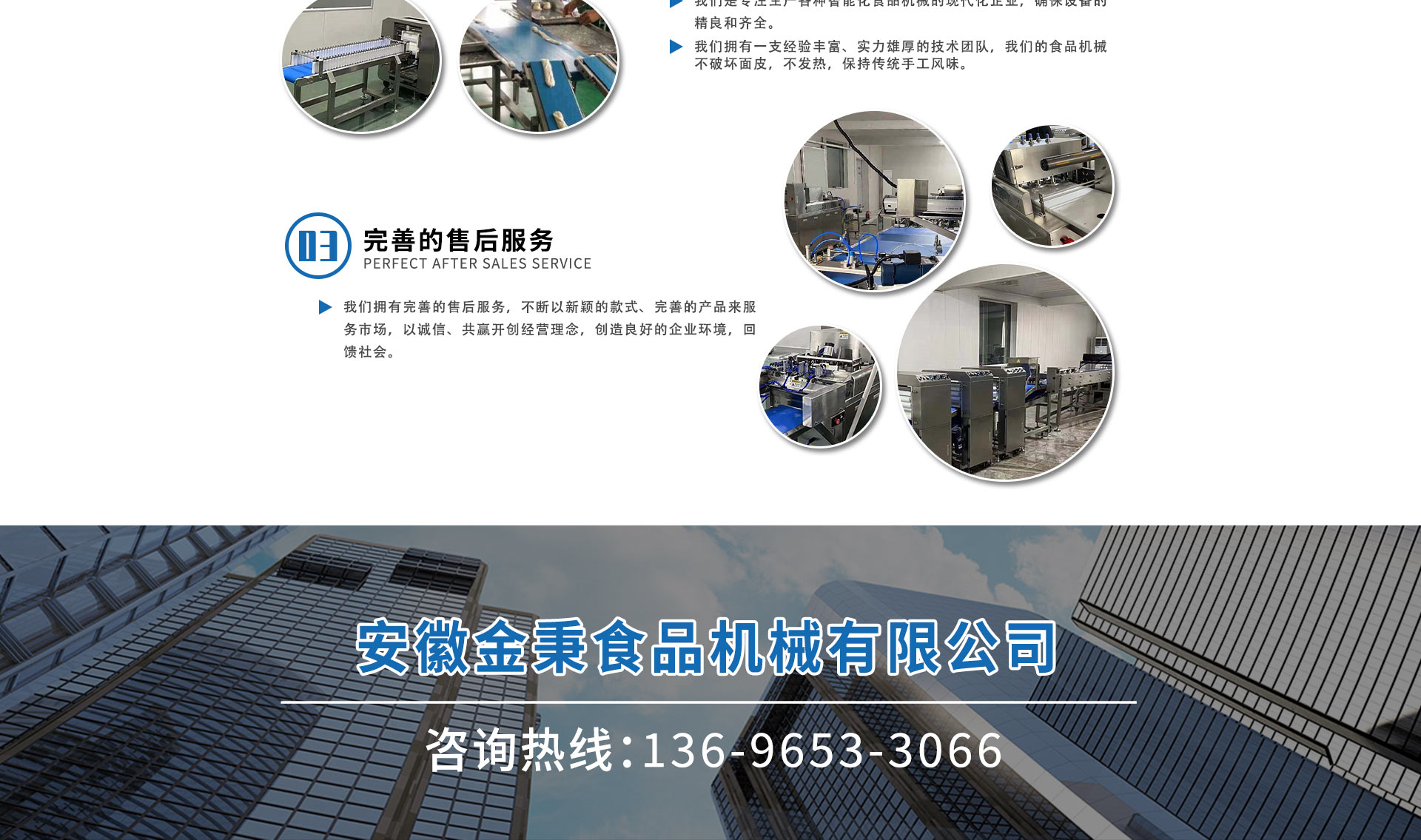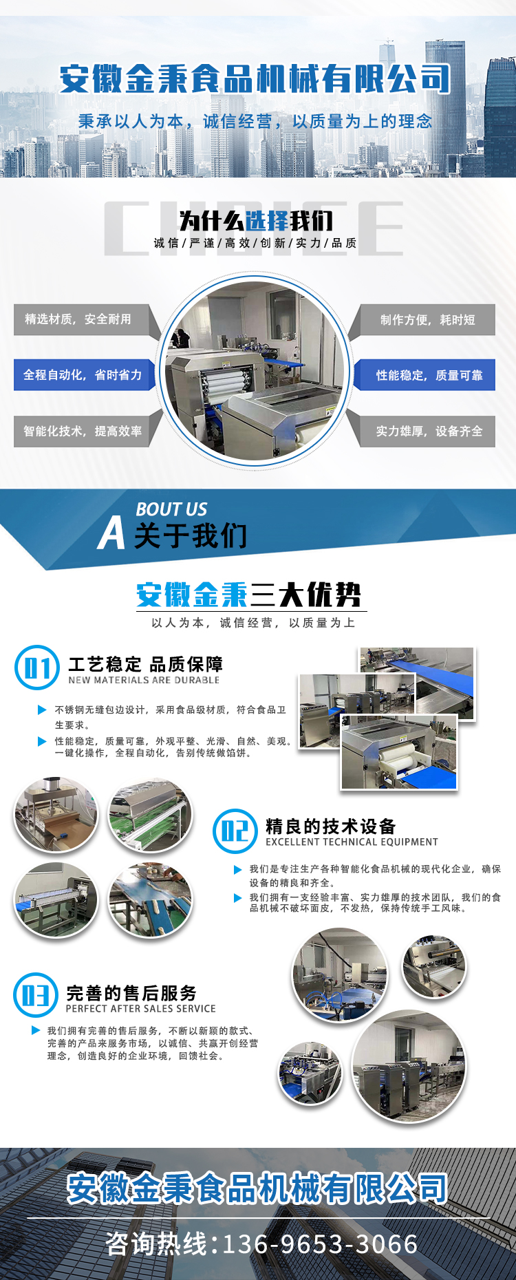 金秉食品機(jī)械有限公司是一家專業(yè)從事食品機(jī)械研制、開發(fā)、生產(chǎn)、銷售、集科、工、貿(mào)為一體的現(xiàn)代化企業(yè)。本公司以客戶需求為導(dǎo)向、技術(shù)創(chuàng)新為源泉,不斷研制出符合行業(yè)特性、實(shí)用性強(qiáng)、適合市場(chǎng)需求的高新技術(shù)產(chǎn)品。公司擁有健全的技術(shù)、生產(chǎn)、質(zhì)檢銷售和售后體系,可根據(jù)客戶需求進(jìn)行個(gè)性化定制,提供食品工藝技術(shù)支持。